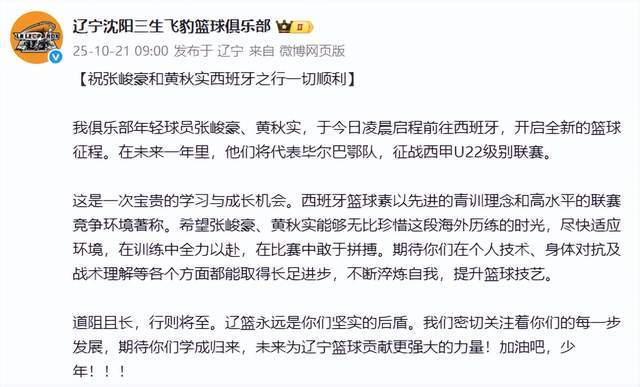 10月21日上午9点,四冠王辽宁男篮正式完成了官宣,宣布了两位被禁赛的小将张峻豪和黄秋实启程前往西班牙,开启征战西甲U22联赛的好消息。至此,一切就尘埃落定了,而在出征之际,辽宁男篮也提出了新要求,都挺暖心的。